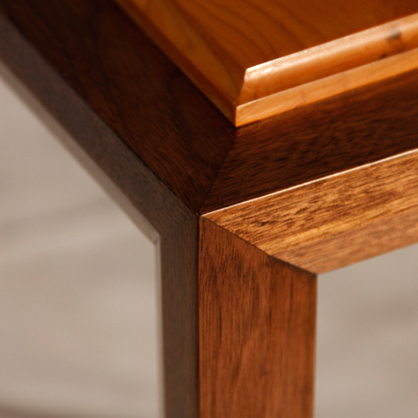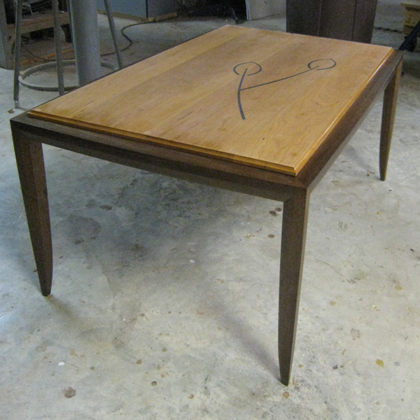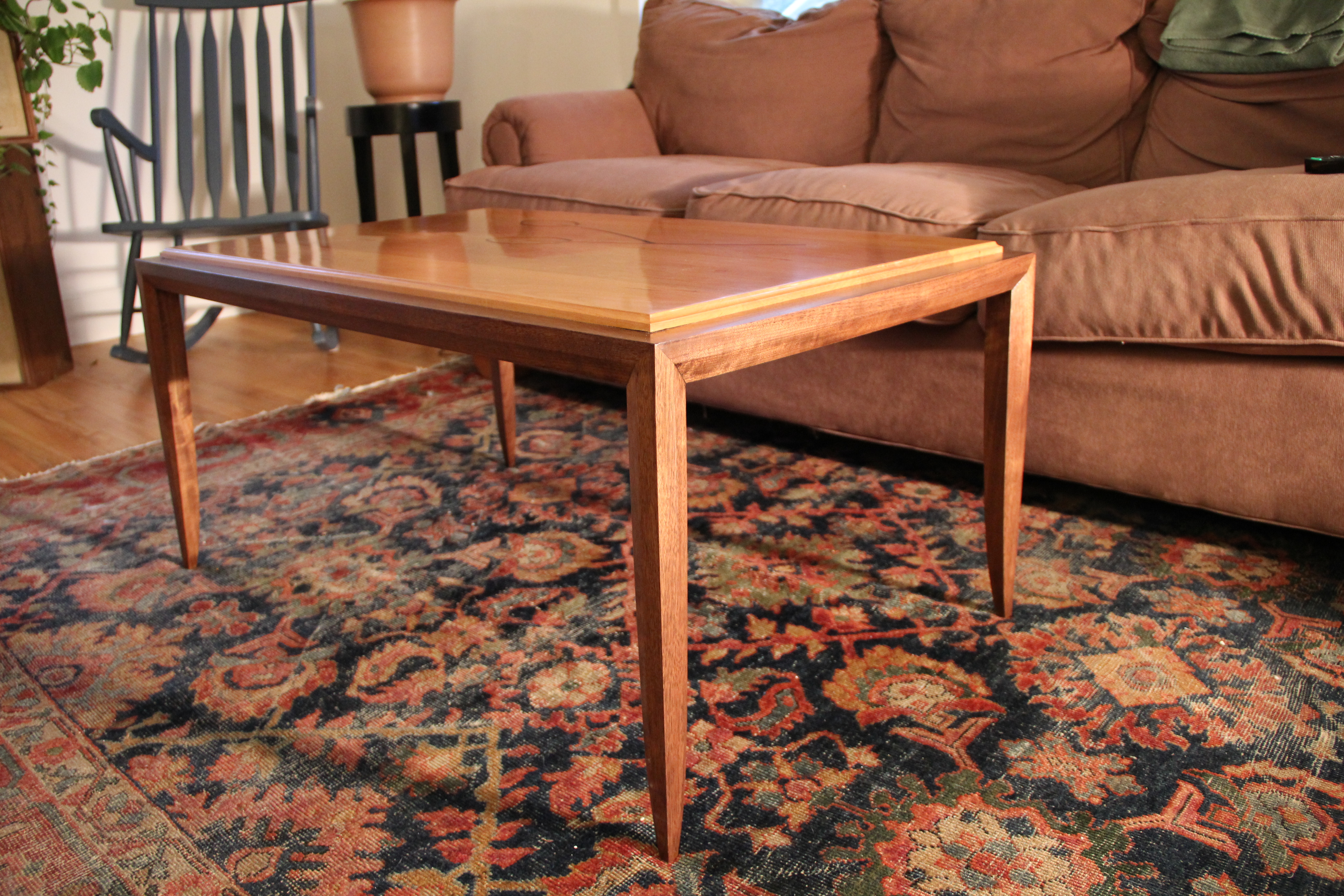 Coffee table in walnut, cherry, and wenge. Features 3 way miters on the corners, and inlay on the top.