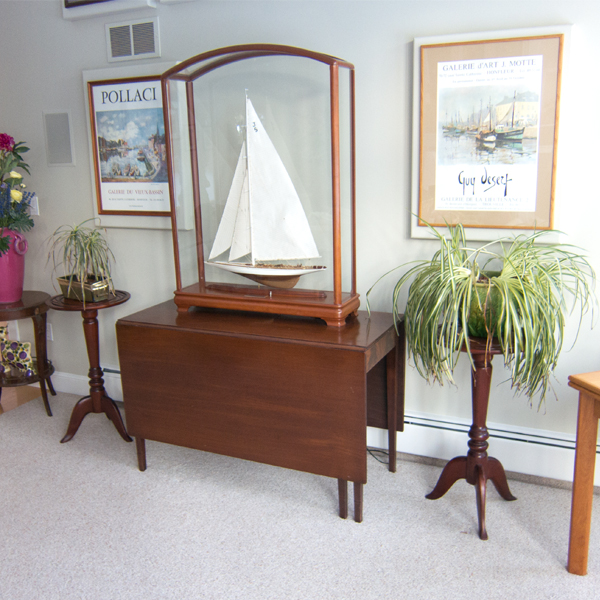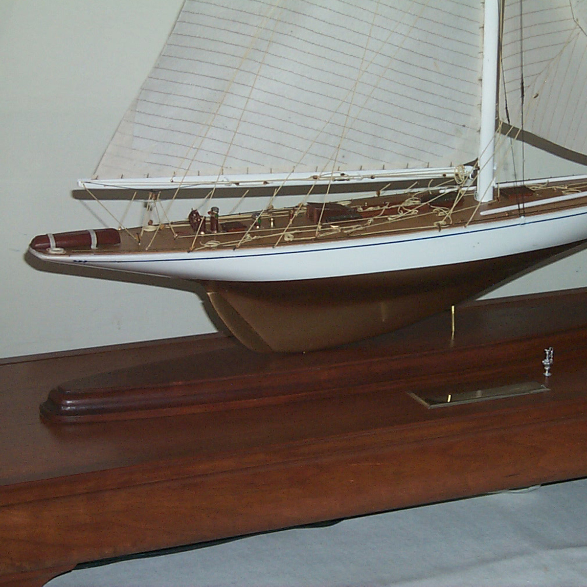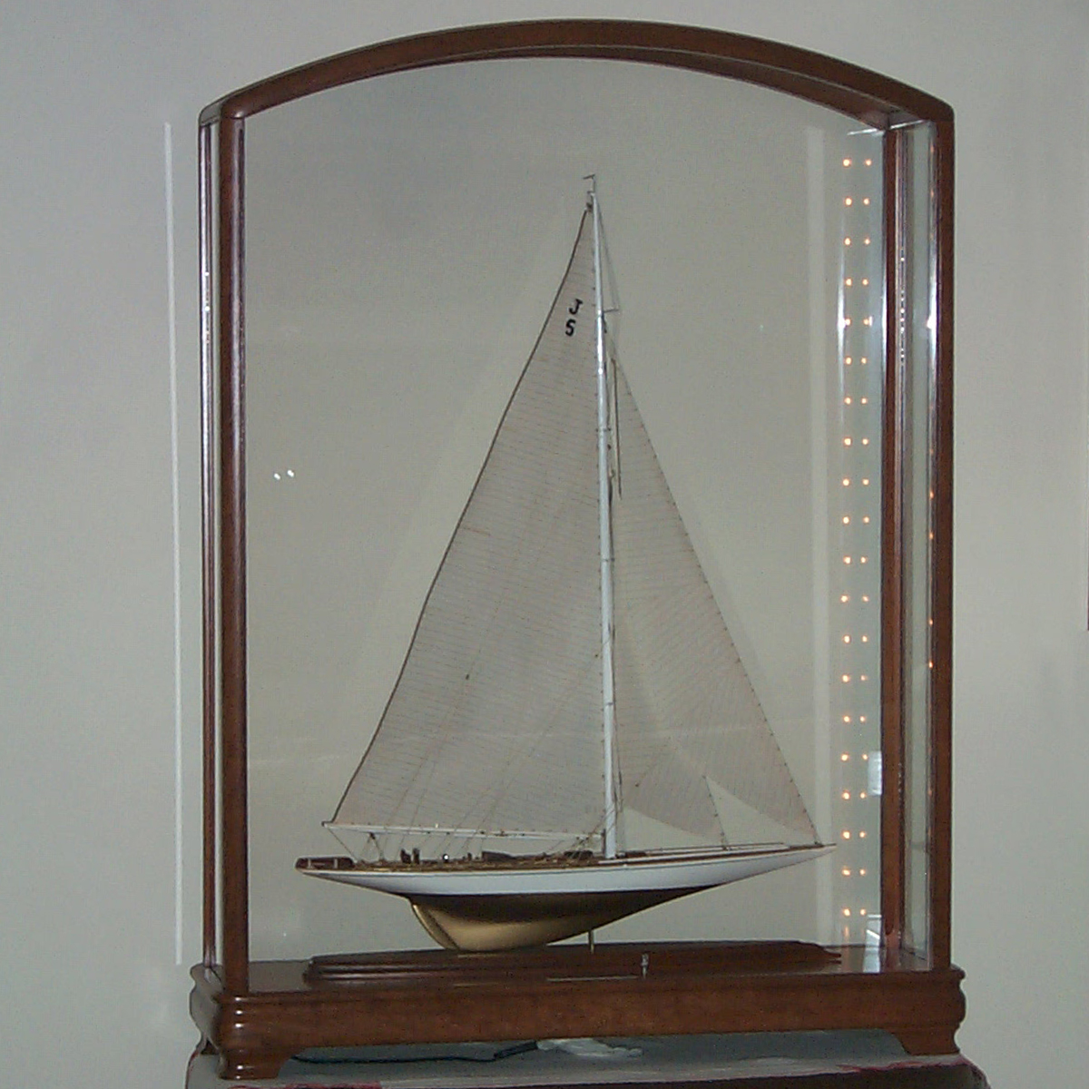 Model of Rainbow, the Americas cup defender in 1934. Plank on frame hull construction. Custom case in cherry is lighted and has curved top.